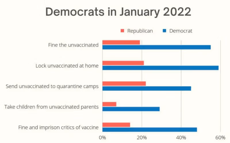 यह केवल मीडिया की बयानबाजी नहीं थी - इसने सीधे तौर पर जनता की धारणा को प्रभावित किया और अतिवादी विचारों को सामान्य बना दिया। जनवरी 2022 का रासमुसेन सर्वेक्षण पता चला कि लगभग आधे डेमोक्रेटिक मतदाता न केवल टीका न लगवाने वालों पर जुर्माना लगाने के पक्ष में थे, बल्कि उन्हें उनके घरों तक सीमित रखने, उन्हें क्वारंटीन कैंपों में भेजने और यहां तक कि उनके बच्चों को भी साथ ले जाने के पक्ष में थे। सार्वजनिक स्वास्थ्य अधिकारियों ने इस शत्रुता को बढ़ावा दिया और फिर उसे बढ़ाया, “बिना टीका लगवाए लोगों की महामारी” की बात करते हुए, दोष की एक ऐसी कहानी बनाई जिसका इस्तेमाल आधुनिक अमेरिका में अभूतपूर्व पैमाने पर भेदभाव को सही ठहराने के लिए किया जाएगा।