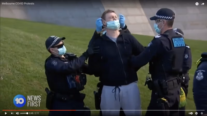 अत्याचारी नियमों द्वारा असंतुष्टों का ऐतिहासिक मुंह बंद करना। अनास्तासिया 1990 में "एस्क्रावा अनास्तासिया" शीर्षक वाली ब्राज़ीलियाई मिनी-सीरीज़ के स्तंभ पर और नीचे, 2020 में ऑस्ट्रेलिया के मेलबर्न में लॉकडाउन विरोधी प्रदर्शनकारी।